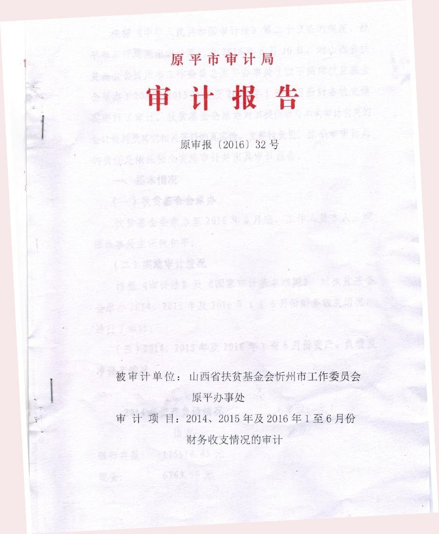 2016年六月根据上级精神,由原平市政府秘书处下文,经原平市民政局批准,在原山西省扶贫基金会忻州市原平市办事处的基础上组建了“原平市扶贫开发协会”,同时对原办事处的财务开支进行了详细的审计。