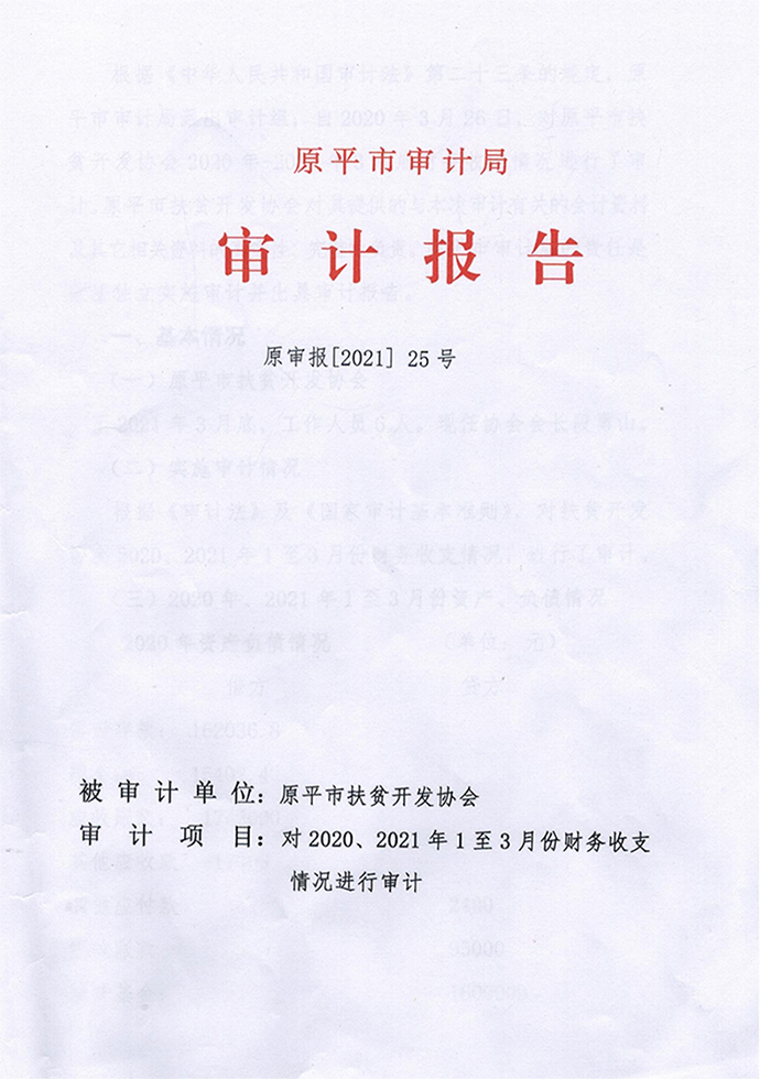 根据《中华人民共和国审计法》第二十三条的规定,原平市审计局派出审计组,自2020年3月26日,对原平市扶贫开发协会2020年-2021年3月底财务收支情况进行了审计。原平市扶贫开发协会对其提供的与本次审计有关的会计资料及其它相关资料的真实性、完整性负责。原平市审计局的责任是依法独立实施审计并出具审计报告。