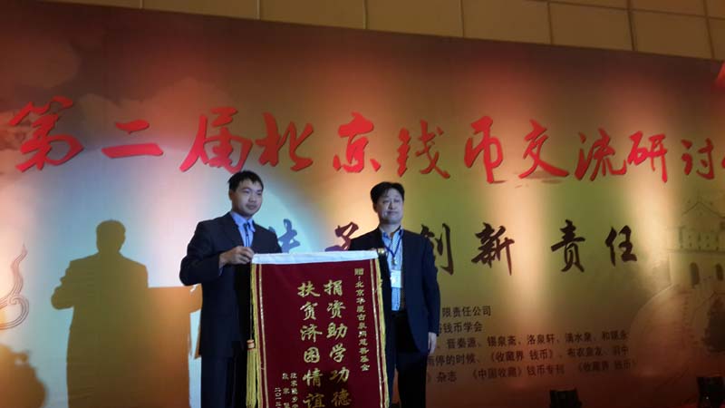 第二届北京钱币交流研讨会于10月11日—13日在北京九华山庄举行。会上对125种古钱币进行了拍卖,此次慈善拍卖会全部拍品5%手续费,用于慈善捐款。今年四月份,北京华夏古泉网慈善基金,对我市扶贫基金会原平办事处捐款20万元,资助42名贫困学生家庭。扶贫基金会原平办事处负责人段补怀,李存和,原平电视台、段家堡联校负责人应邀参加了这次会议。会上段家堡联校长郝月柱同志代表受助学生及家长在拍卖会上发言,介绍了革命老区原平贫困地区的情况,对北京华夏古泉网慈善基金的资助表示感谢,同时代表受助地区段家堡联校、南白联校向北京华夏古泉网慈善基金赠送了牌篇和锦旗。