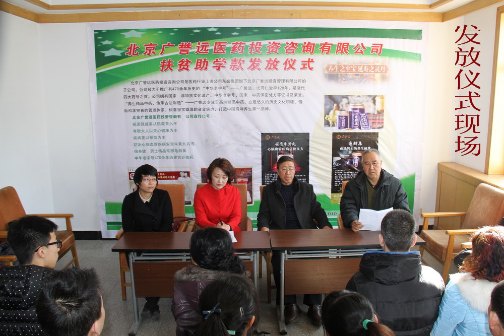 北京广誉远医药投资咨询有限公司资助山西省原平市困难学生助学金发放仪式2015年2月11日在原平市宾馆召开