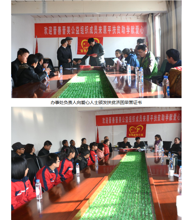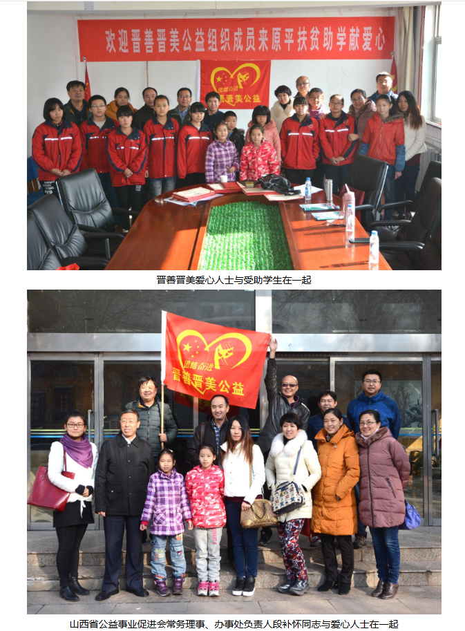 太原青年组建的晋善晋美公益,通过爱的桥梁互联网+的方式,把社会爱的资源动员起来,扶贫济困献爱心,他们依托山西省扶贫基金会忻州市原平办事处提供的精诚服务,从推选的贫困学生中挑选了十多名品学兼优的学生确定为资助对象,原平办事处为孩子们联系办了“红领巾”卡,款直接打到卡上,做到了资助者放心,受助者高兴,办事者舒心。
