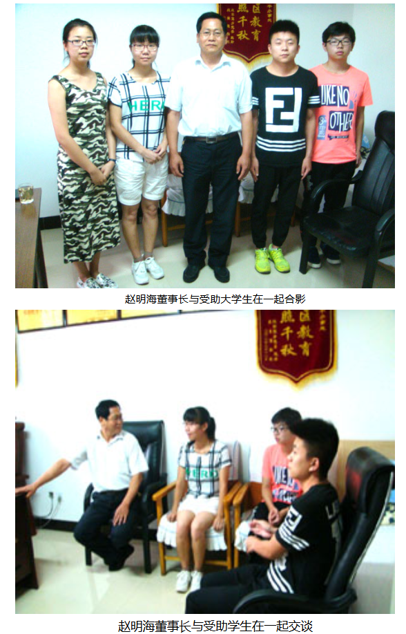 山西省佳诚液压股份有限公司董事长赵明海资助贫困大学生谈会8月7日在市宾馆召开。赵明海先生从2012年开始对范亭中学一年级的六名贫困高一学生开始资助,每年3000元,一直资助到高中毕业,对其中四名考入大学的贫困学生继续资助到大学毕业,帮助他们顺利完成学业。8月7日和即将进入大三的大学生在一起坐谈,并发放了资助金。赵明海先生要求他们努力学习,完成学业。报效祖国,汇报社会。学生们表示决不辜负赵明海董事长的关心帮助,加倍努力,完成学业,立志成才,以实际行动汇报社会,回报赵董事长的关爱。