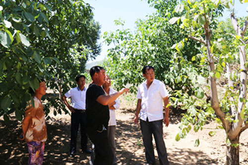 上图是原平市农机中心住刘家尧村扶贫干部在实地向大家介绍核桃嫁接新品种经济效益