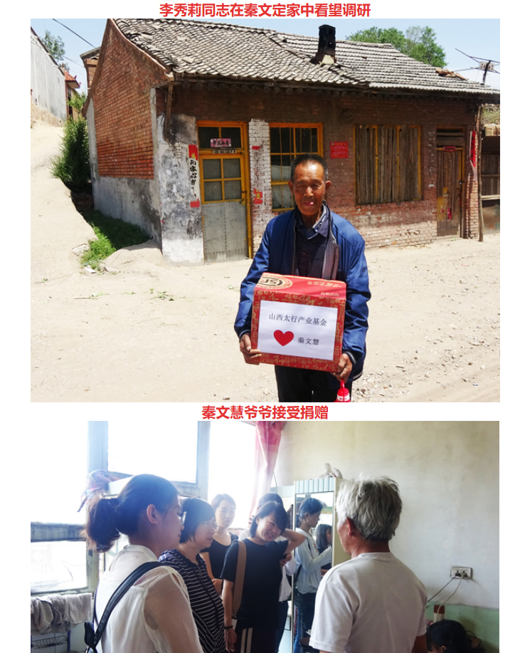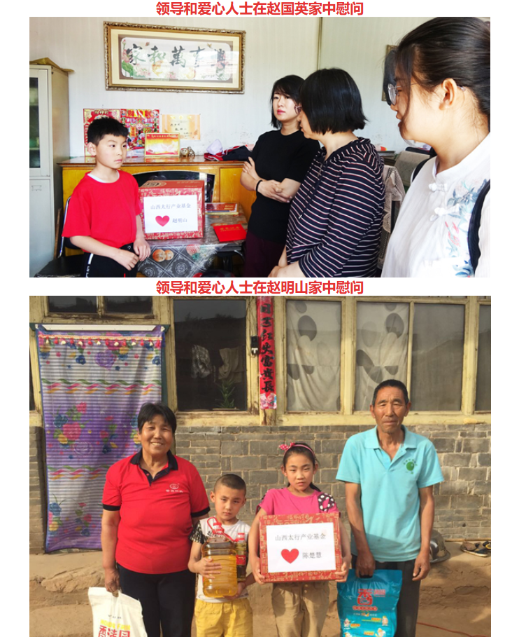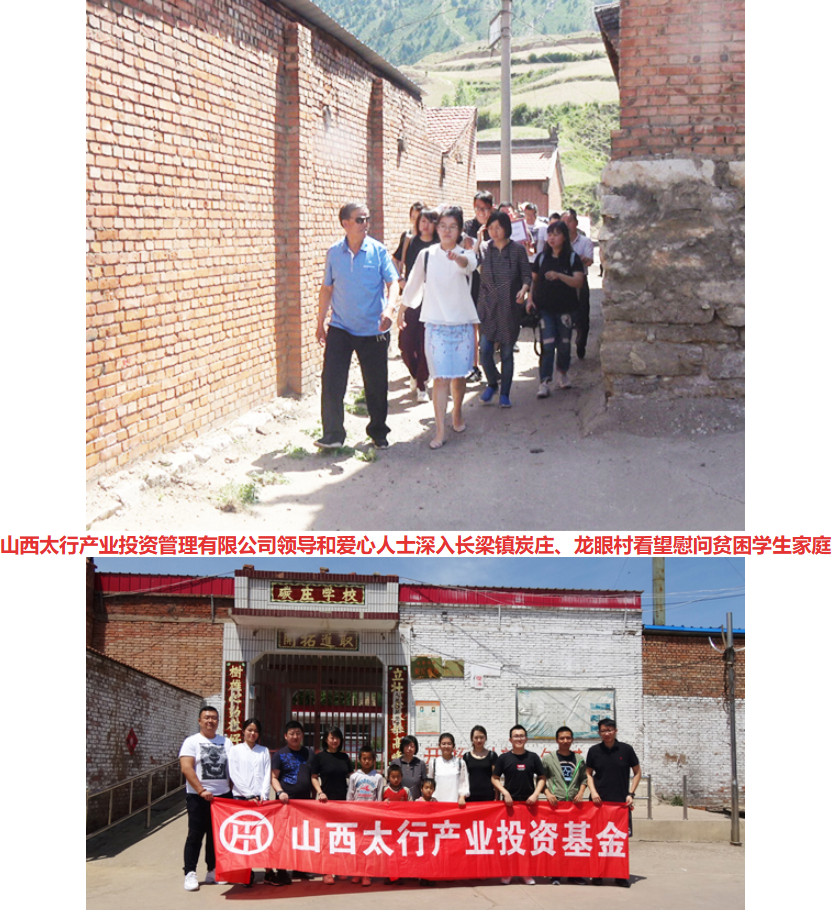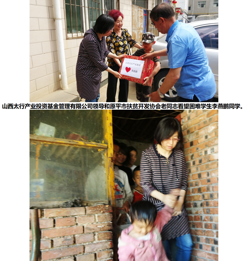 2018年6月1日在“六一”儿童节到来之际,山西太行产业投资基金管理有限公司党委副书记、纪委书记王秀莉、公司副总经理贾丽莎等11人爱心人士专程来到原平市贫困山区长梁沟镇炭庄、龙眼村深入贫困学生家庭看望并慰问。给他们带去生活用品及学习用具。