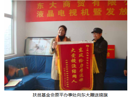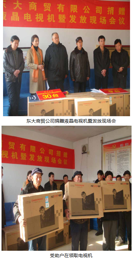 2013年1月22日山西省扶贫基金会原平办事处在沿沟乡组织召开“东大商贸有限公司捐赠液晶电视机暨发放现场会议”参加会议的有东大商贸有限公司负责同志王荣,省扶贫基金会原平办事处副主任段补怀、李存和,沿沟乡党委书记张军胜、乡长韩飞龙,受助乡镇社会扶贫联络员及受助困难户代表,会议首先由扶贫基金会原平办事处负责人段补怀同志讲了话,他主要介绍了东大公司近年来为社会做善事,献爱心的生动事迹,他赞扬东大公司经营效益并不是原平的******企事业,但他们这种汇报社会汇报原平人民的精神是全市每个企业应该学习的,这种中华民族的美德是应该赞扬和宣传的。会上由东大商贸有限公司负责人王荣同志向扶贫基金会原平办事处捐赠29寸液晶电视机30台,由扶贫基金会原平办事处分别转赠给沿沟乡、大林乡、段家堡乡、东社镇的30个无电视机的贫困户。扶贫基金会原平办事处向东大商贸有限公司赠送锦旗,向东大商贸有限公司总经理胡秀平同志颁发了扶贫济困献爱心荣誉证书。