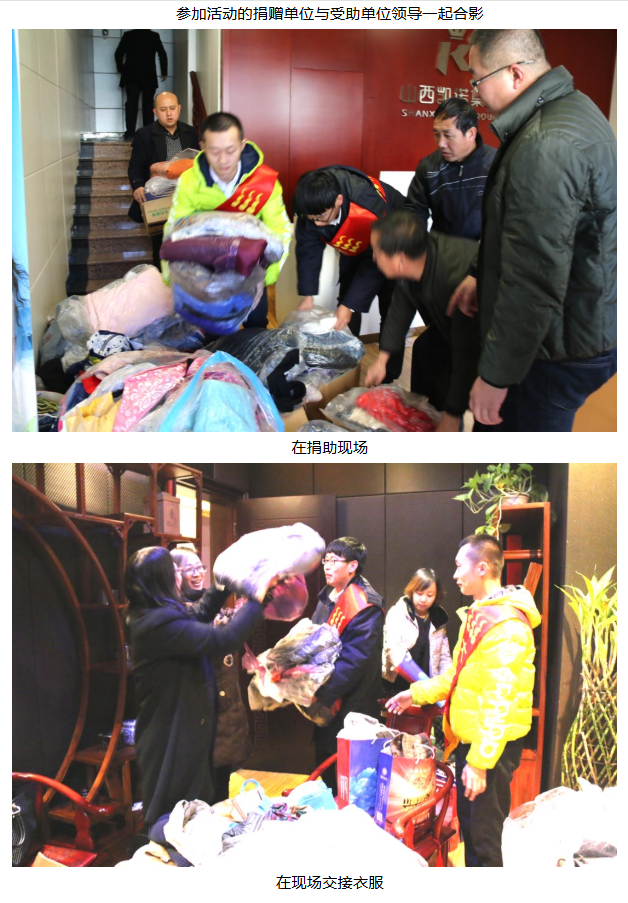 山西省公益事业促进会秘书长郭翠玲同志代表爱心人士将1500多件各式各样衣服捐赠给山西省扶贫基金会忻州市原平市办事处。办事处当场将这些衣服分发到一同前来参加活动的原平市南白乡、东社镇、段家堡乡的七个贫困村庄。这七个村的党支部******书记接受了捐赠。他们将这些衣服带回村里分发到贫困户中。