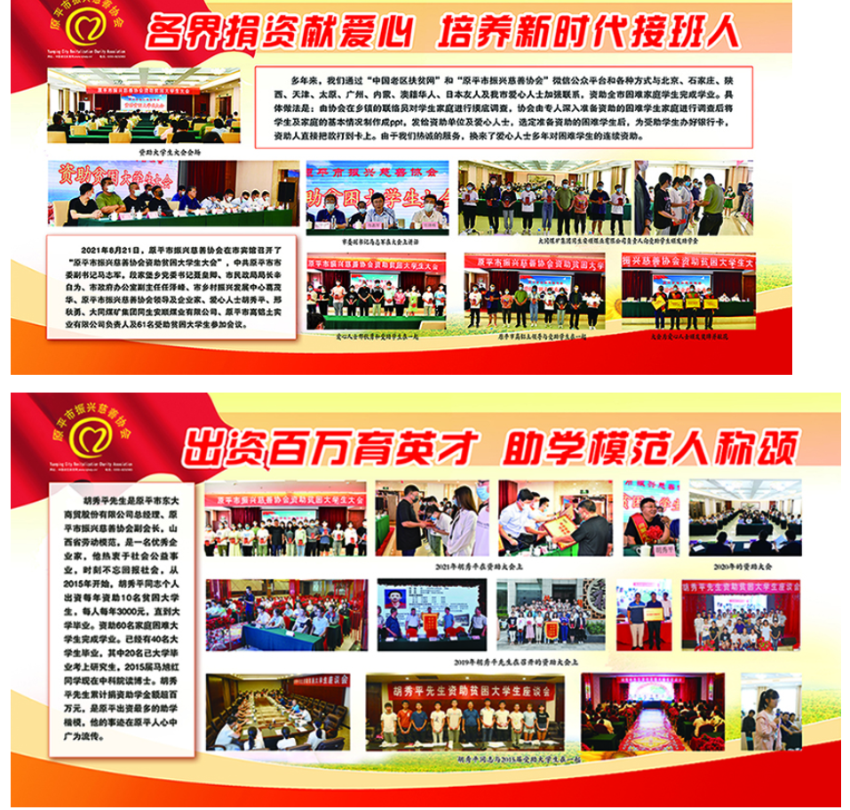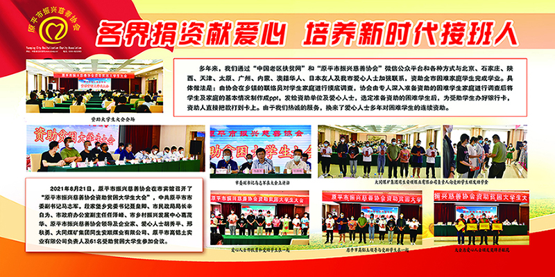 <span font-size:20px;"="" style="font-family: 微软雅黑; font-size: 14px; color: rgb(34, 34, 34);">原平市振兴慈善协会2022年8月16日在市人民广场召开资助大学生大会。<span font-size:16px;"="" style="font-family: 微软雅黑; font-size: 14px; color: rgb(34, 34, 34);">大会期间原平市振兴慈善协会“慈善助困,乡村振兴”展览同时在人民广场展出,展板共10块,主要内容是介绍了原平市振兴慈善协会的基本情况,近年来的主要工作:一是帮助农民发展特色种植、发展家庭养殖、兴办家庭微型企业等发展生产脱贫致富奔小康。二是为巩固脱贫成果,实施乡村振兴战略,建设美丽家园在全市进行红枣、核桃树高枝嫁接,大面积推广红枣、核桃新品种。三是为企业家、爱心人士牵线搭桥资助家庭困难的学生完成学业。四是组织慈善募捐,帮助农村比较困难的人群。等具体情况。