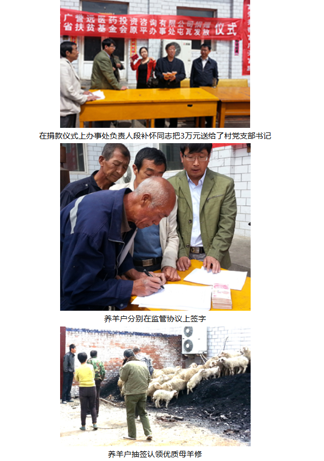 北京广誉远医药投资咨询有限公司向山西省扶贫基金会原平办事处捐赠3万元,资助原平市楼板乡屯瓦村二十五户困难村民养羊发放仪式于2015年5月11日在屯瓦村举行。