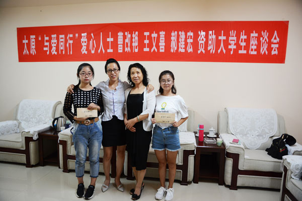 2017年8月13日太原”与受同行”爱心人士曹改艳等来我市看望他们一直资助的贫困大学生,与他们一起座谈,受助学生汇报了他们的学习情况和在校的生活情况。曹改艳等向他们又发放了每人3000元的资助金。