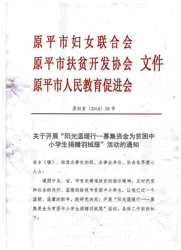 原平市妇女联合会、原平市扶贫开发协会、原平市人民教育促进会联合发出通知开展“阳光温暖行——募集资金为贫困中小学生捐赠羽绒服”